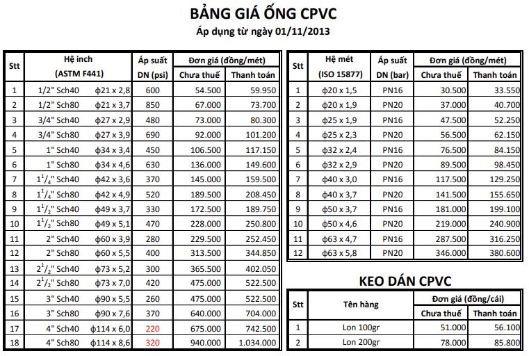 - Bảng giá ống CPVC CHINA